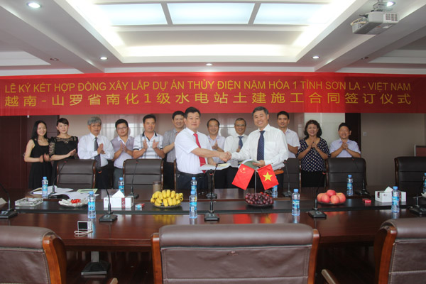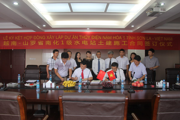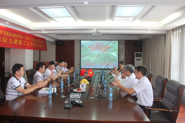 2013年7月22日,越南山罗省南化一级水电枢纽项目建设合同签字仪式在我公司南昌市总部顺利举行,越南ANPHA水电投资股份公司董事长阮平阳和我公司董事长王元旦分别代表双方签署合同。出席签约仪式的还有越南建设与机电股份公司(MECO)董事长阮玉平、ANPHA水电投资股份公司总经理陈重朵,我公司副总经理张周平、副总工程师邹春明、项目经理夏爱民等。