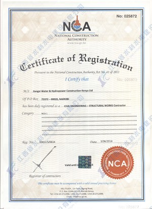 江西省水利水电建设有限公司肯尼亚分公司接到通告后,积极准备相关资料,凭借公司的技术实力和肯尼亚市场的良好业绩,最终取得所有六项的一级证书。其中包括:水利施工一级,公路工程施工一级,房屋建筑工程施工一级,结构施工一级,电力工程施工一级和机电工程施工一级,有力地提升公司的品牌影响,提升了公司资信竞争力,为公司在肯尼亚各项工作的全面深入开展创造了积极有利的条件。